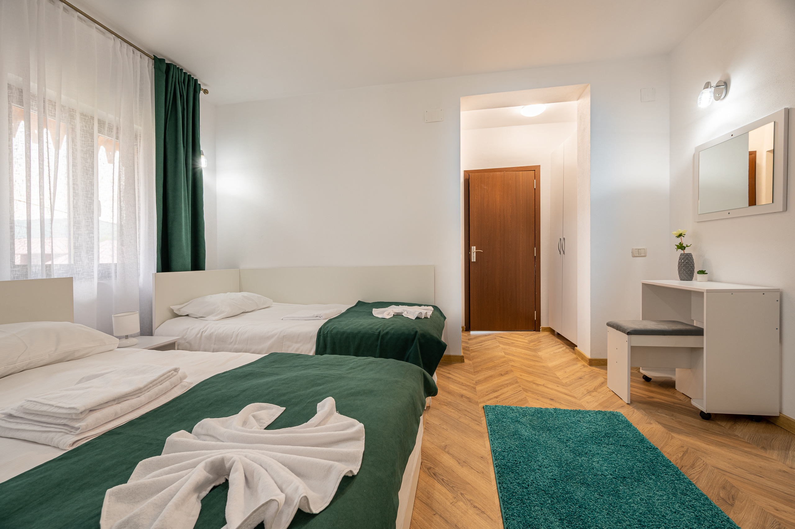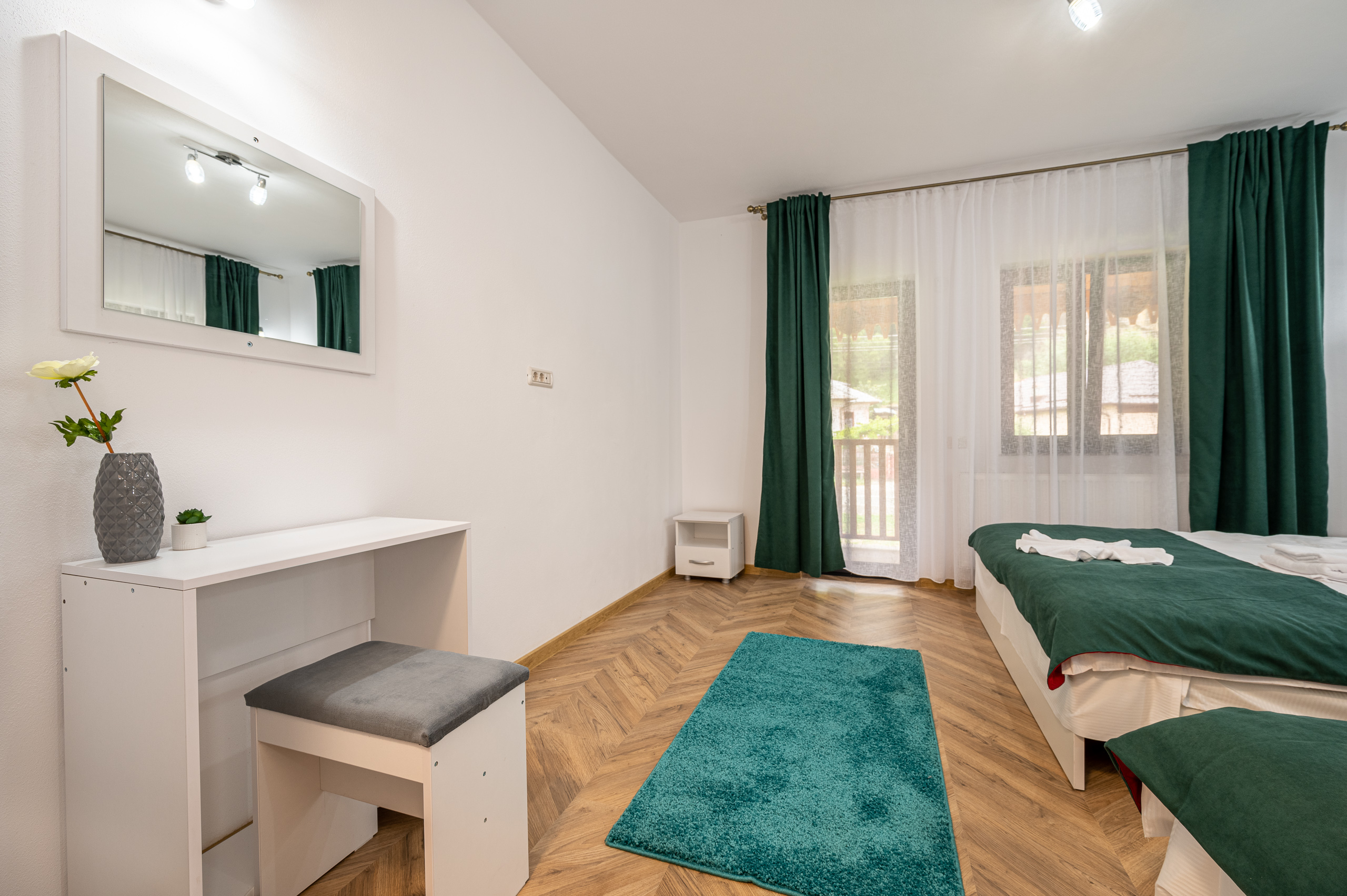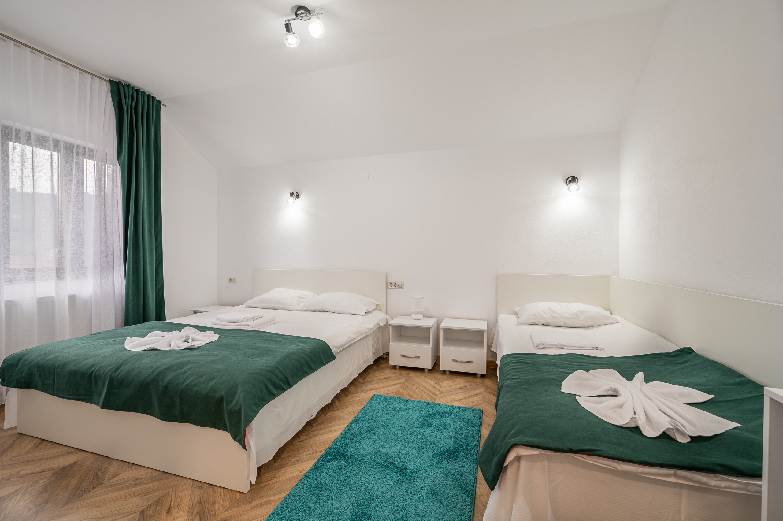Pensiunea noastra dispune de 3 camere, numite dupa cei 3 munti din zona ei, cu suprafete de 17 mp, dotate cu cate 2 paturi, unul de 200×160 cm si unul de 200×90 cm, grup sanitar propriu cu cabina de dus, televizor smart, dulap de haine incapator si wifi gratuit.